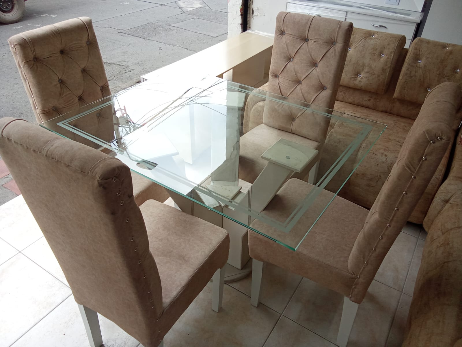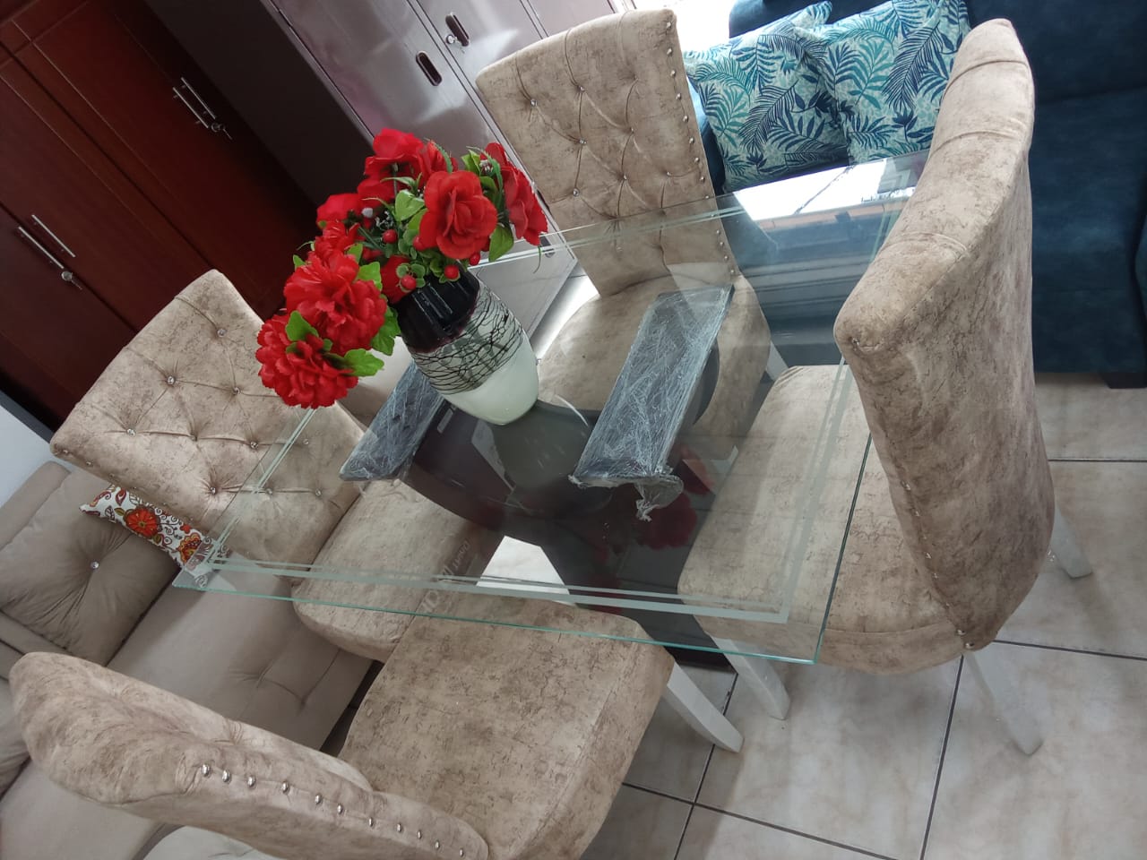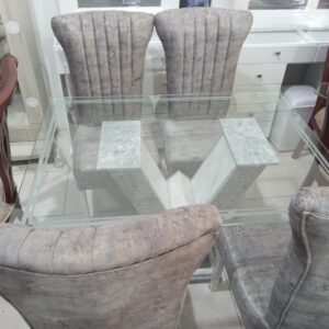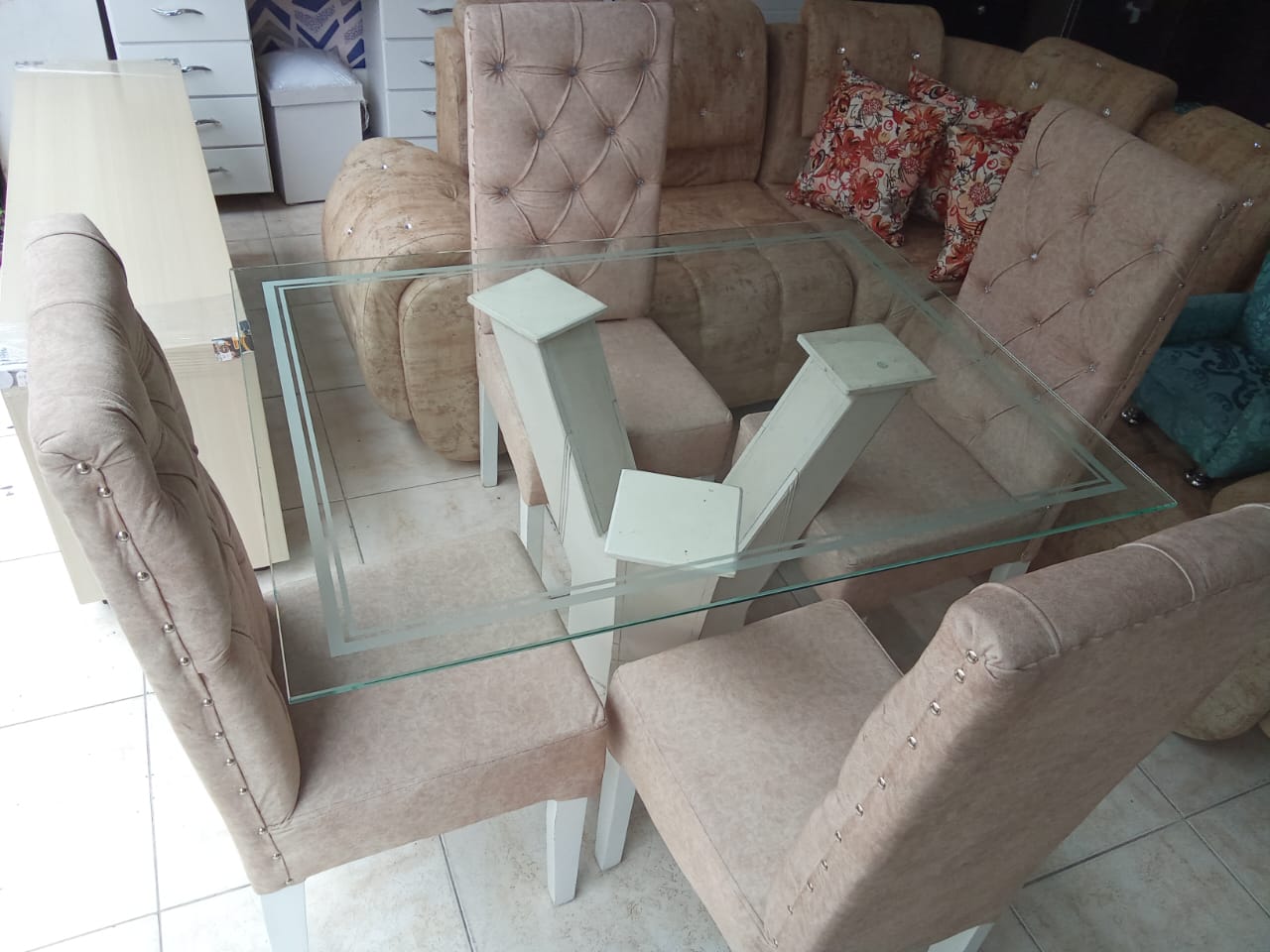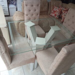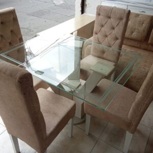 Comedor De Lujo 4 Puestos Con Sillas Tapizadas elaborado en madera de pino con vidrio de 6ml con base en Marmol por tan solo $1.400.000.