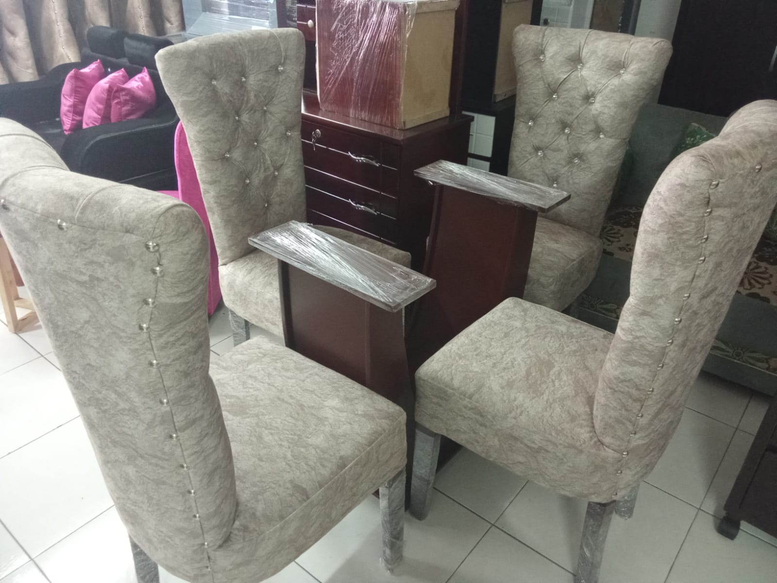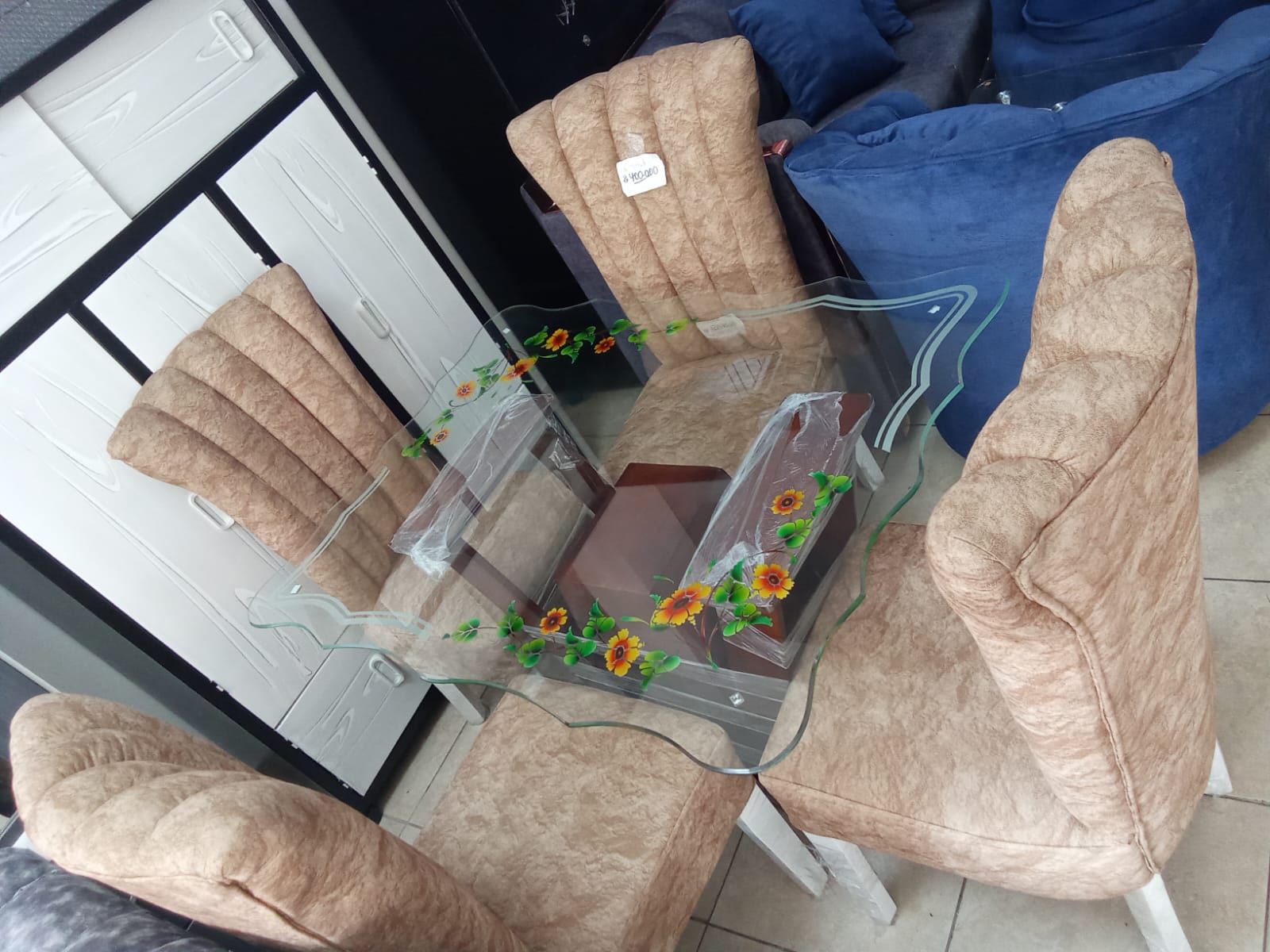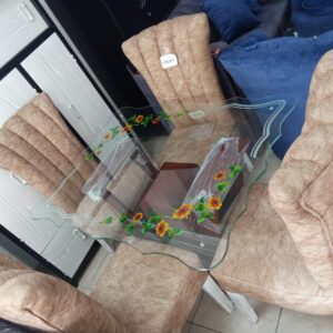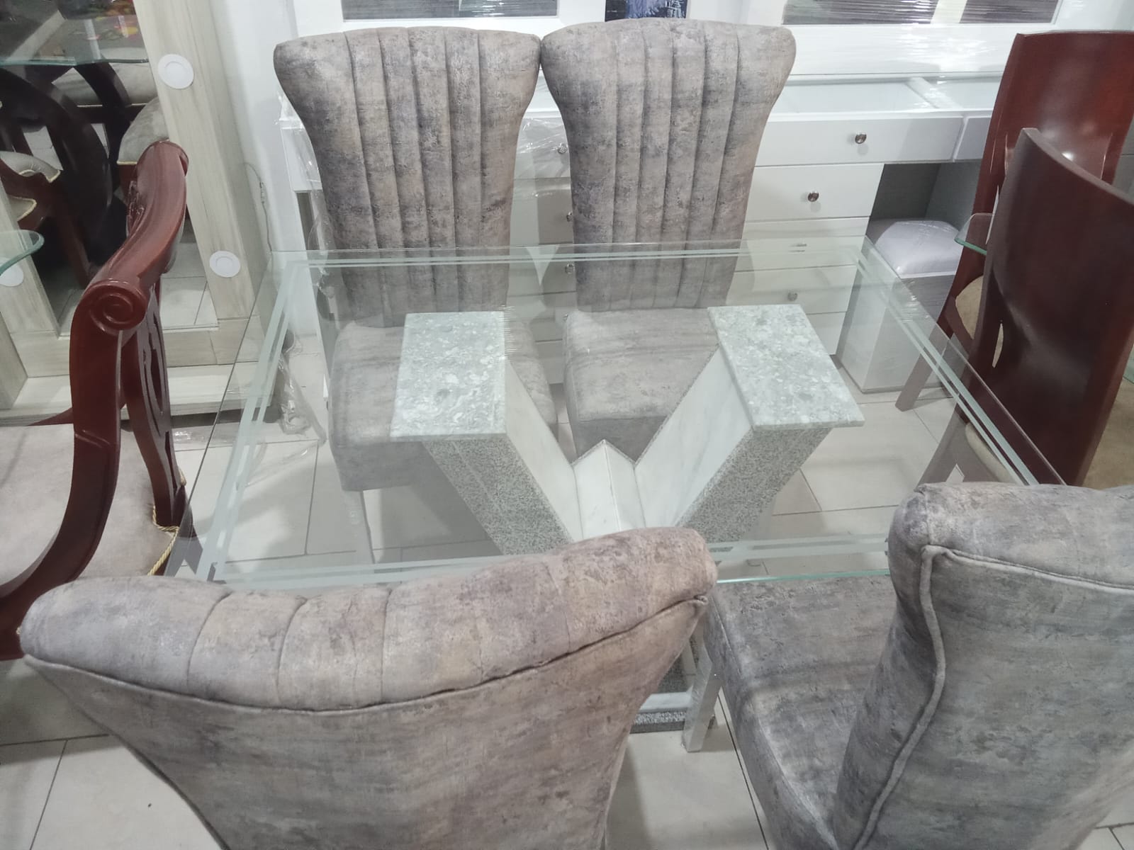 Comedor De Lujo 4 Puestos Con Sillas Tapizadas elaborado en madera de pino con vidrio de 6ml con base en Marmol por tan solo $1.400.000.