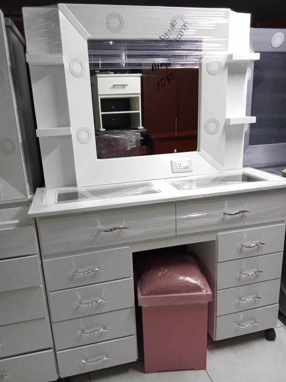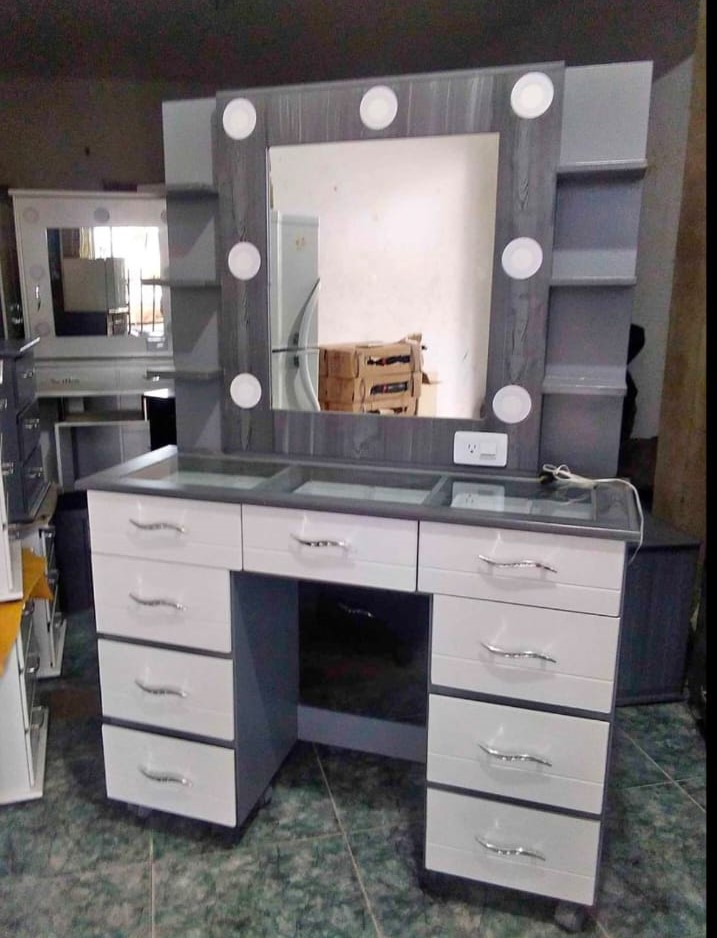 Tocador Hollywood Grande Repisa elaborado en madera MDF con cajones todo riel, mide 1.80m de altura x 1.20 de ancho